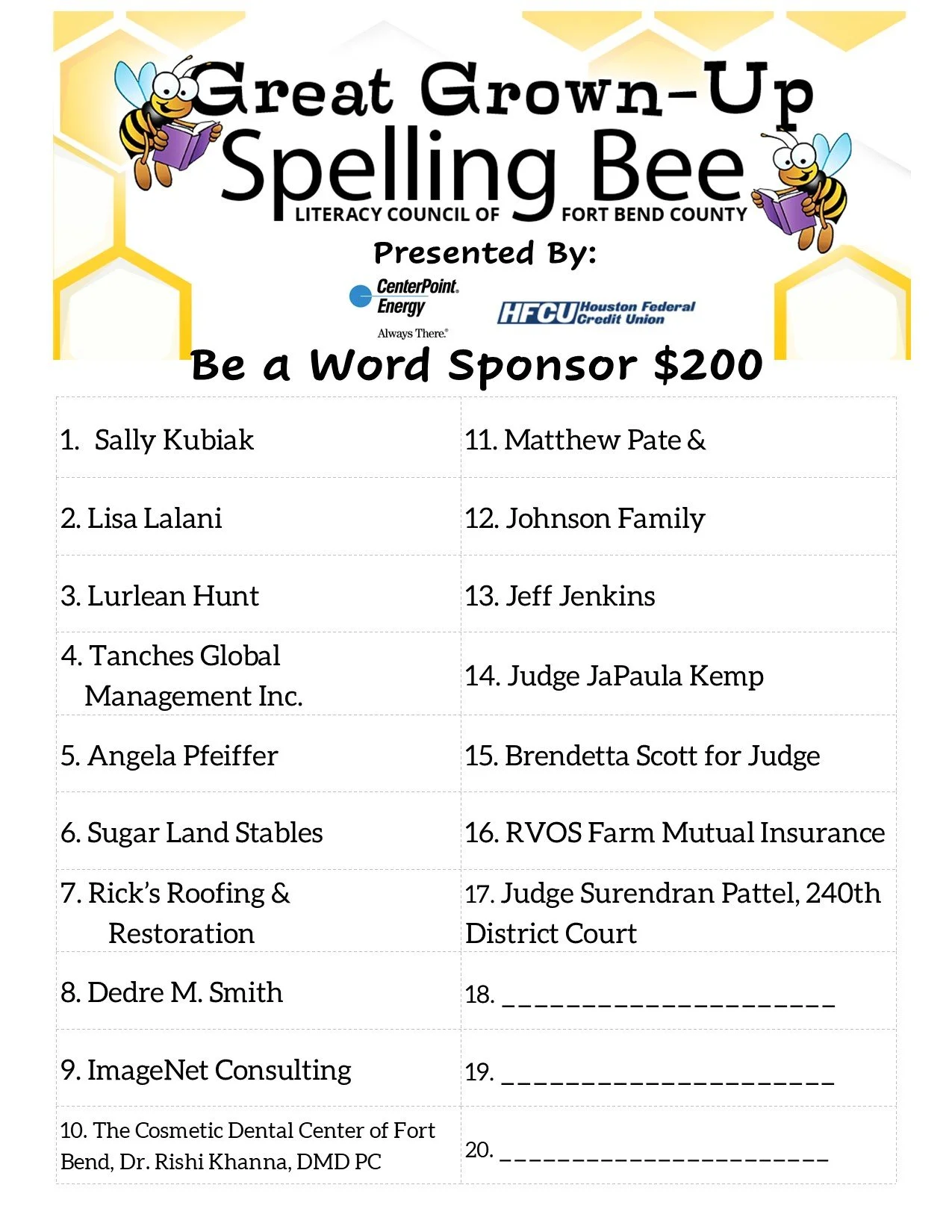 You can also show support by bee-ing a LETTER sponsor for $100 or a WORD sponsor for $200! WORD sponsorship included admission for two to the event.